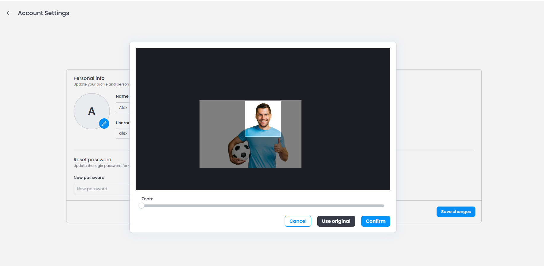 Once you have selected the photo you want, click on “Open” and a window for sizing will appear, along with the options to accept and discard. To size the photo, use the scroll button on your mouse to adjust the proportion of the photo. When finished, select the confirm button. If you want to repeat the process, click on the trash can button to discard the photo. You need to wait for the photo to load completely and then save the changes you have made using the Save button.