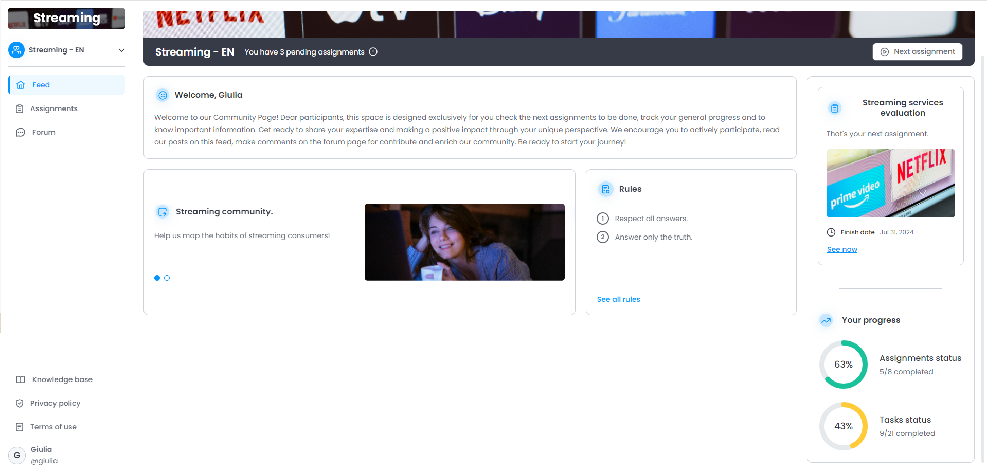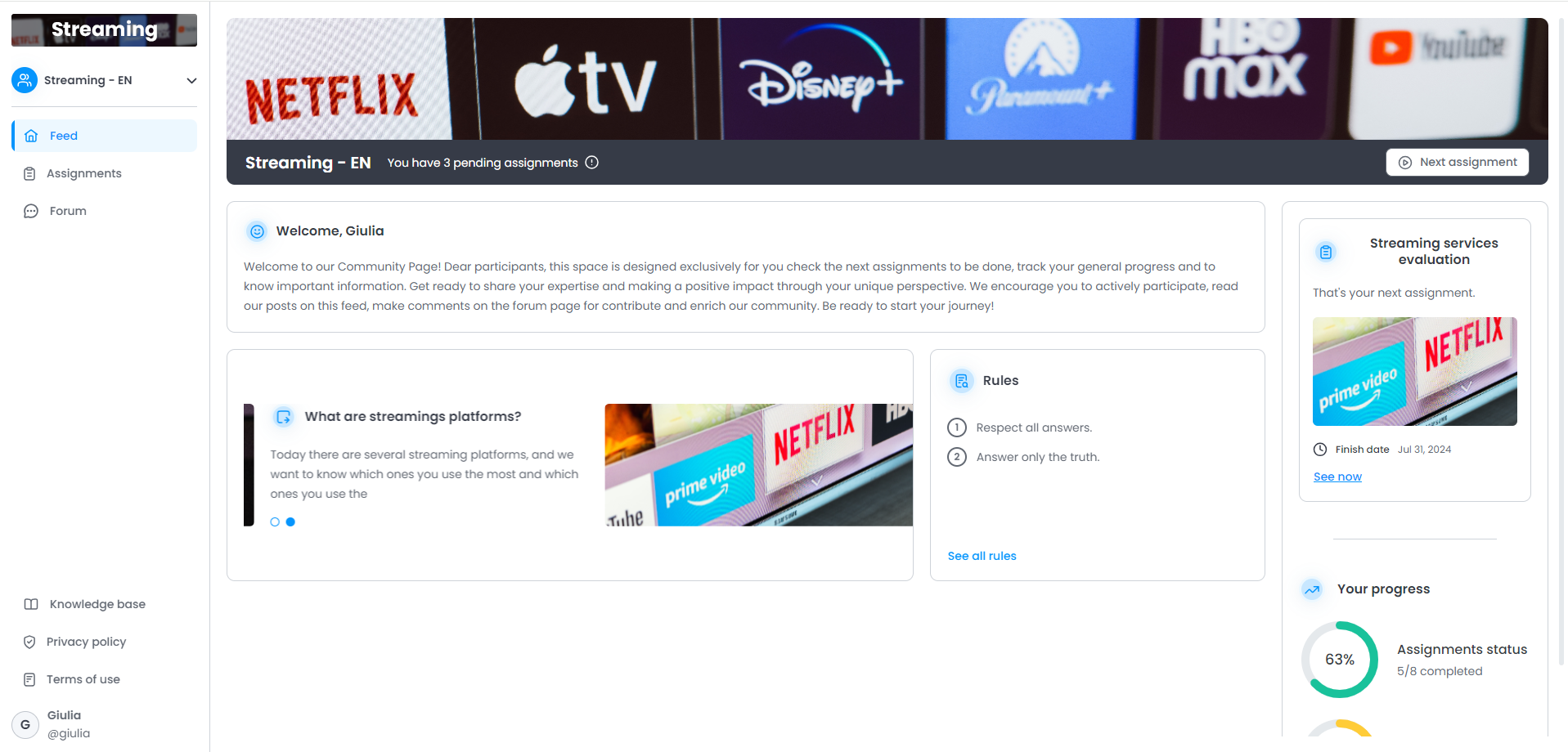 In the “Feed”, the Participant will be able to view all the Community assignments, as well as check the pending activities and their progress, and the Community Guide.