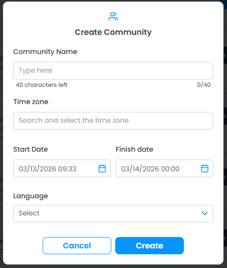 Keep in mind that the dates and times will follow the selected time zone. If you are in a different time zone than the one configured on the platform, make sure to consider the time difference when scheduling your community.