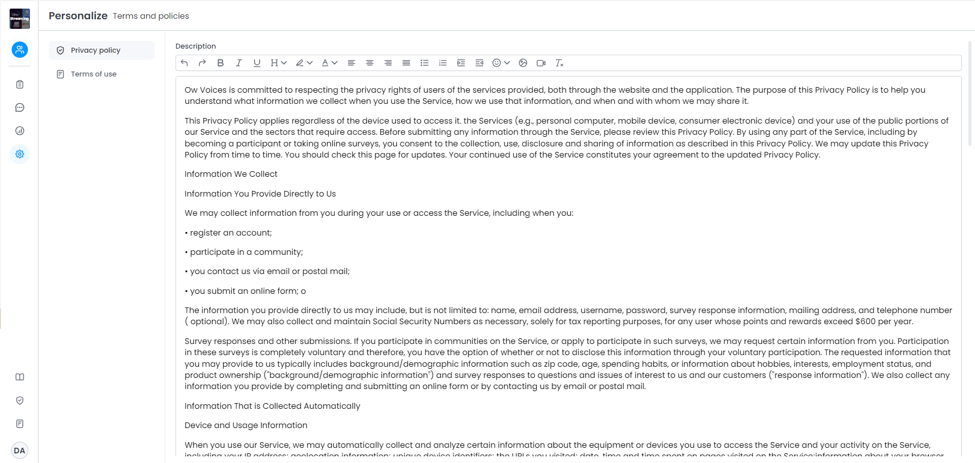 The Terms of Use and Privacy Policy related to the OW Voices platform are initially standardized. This means that whenever a community is created, the OW Voices Standard Terms and Policies will already be in place.