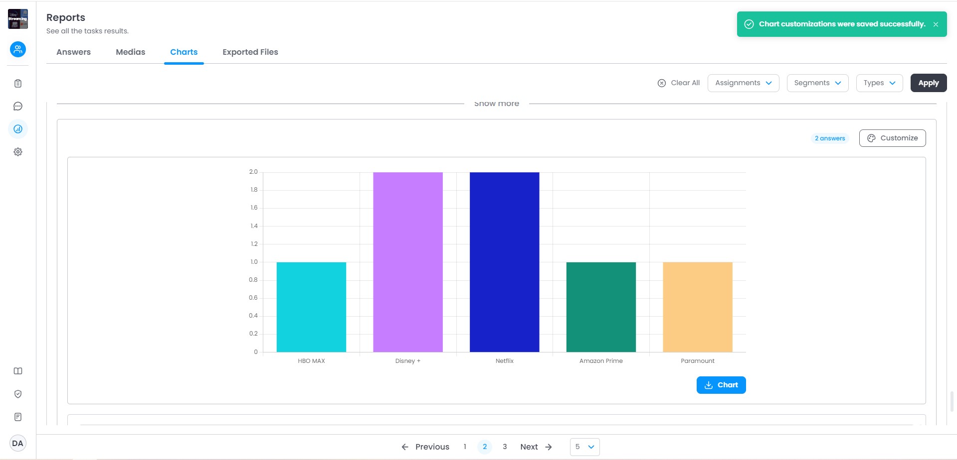 In the “Reports” menu, Administrators, Moderators and Observers will be able to view graphs for all types of tasks. For tasks of the Survey type, a graph will be generated with the answer options differentiated by color.