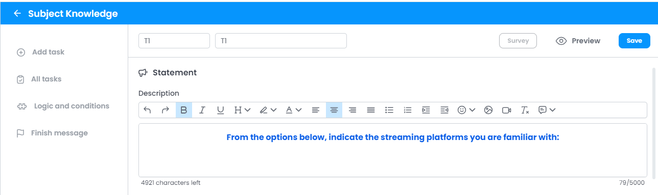 3. You can also change the task (question) code using the rounded field next to the task list. The code of a task is important for identifying the question in the database and also for viewing the answers on the platform. Ow Voices will always place the screen “T” followed by a natural number in ascending order for task codes.