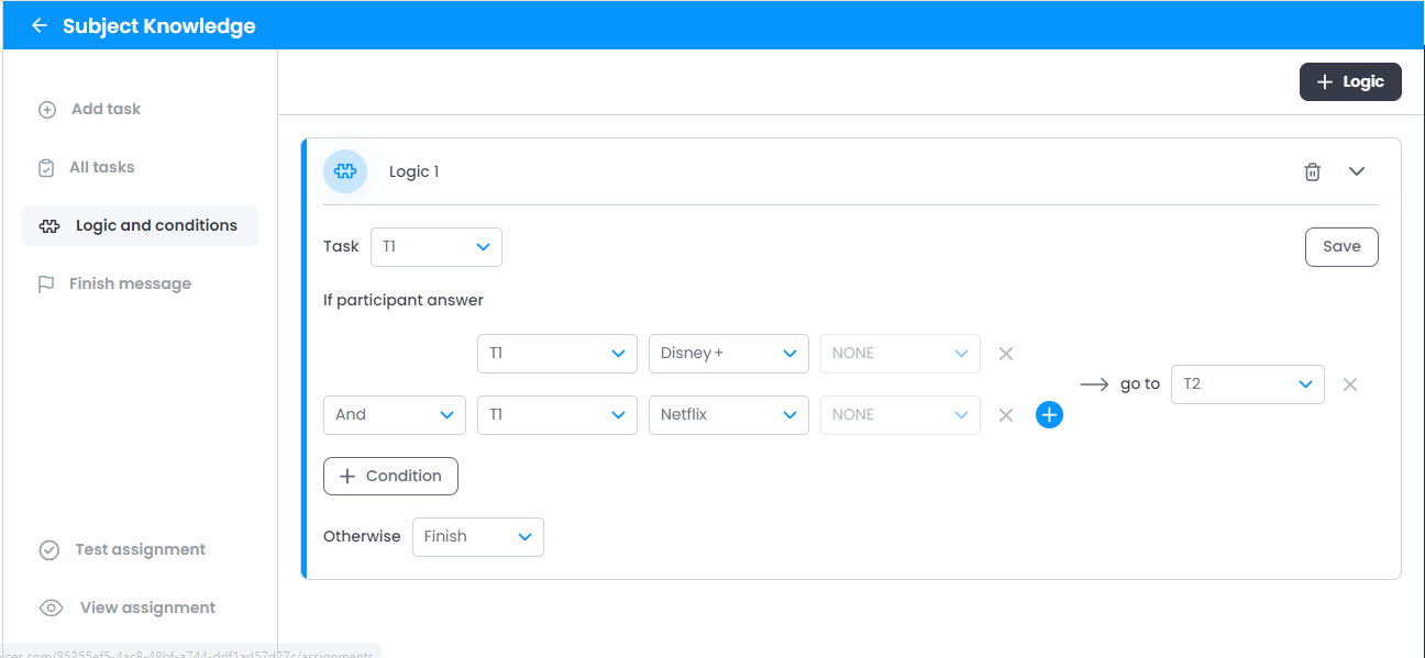 Default → define which task the respondent will be redirected to after answering the current task. Here you can add a jump or even choose “finish”. This option will only be applied if the respondent does not qualify for the other conditions specified in “If you answer”.