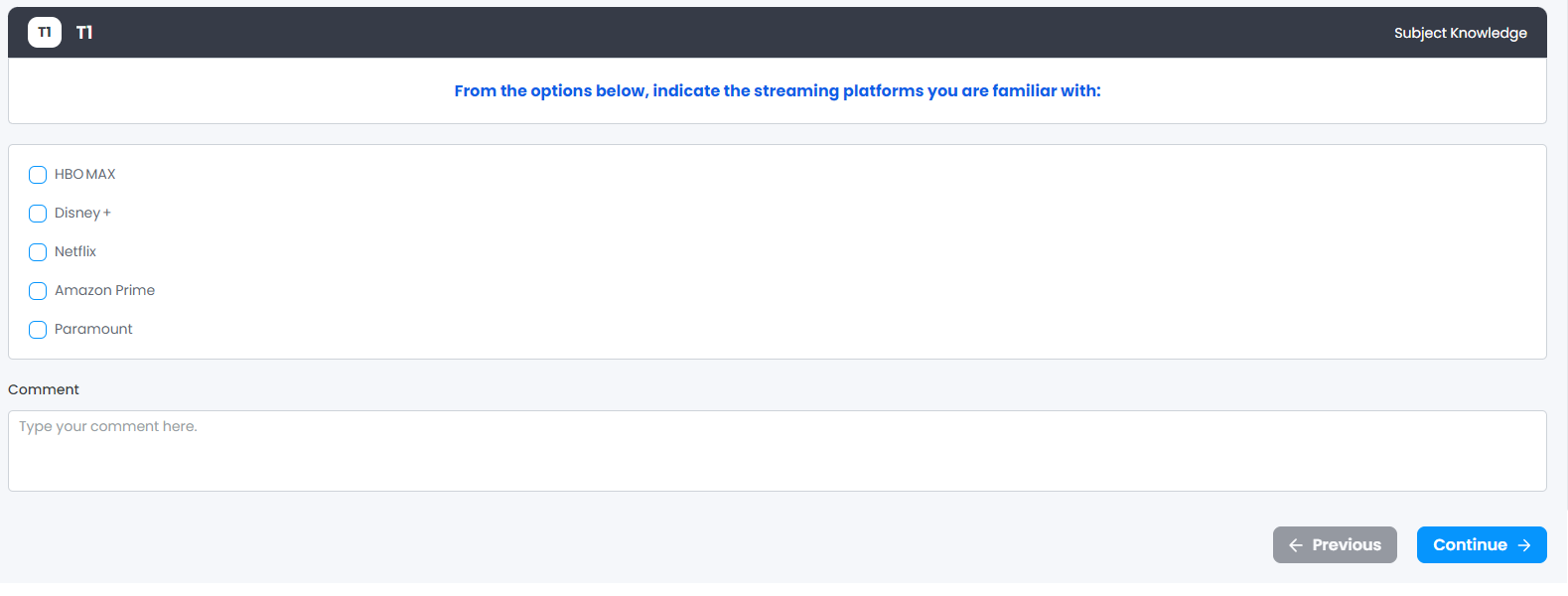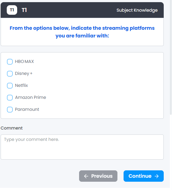 A survey is a type of task that presents the participant with a list of predefined options from which they are asked to select one (single choice) or more (multiple choice) answers.