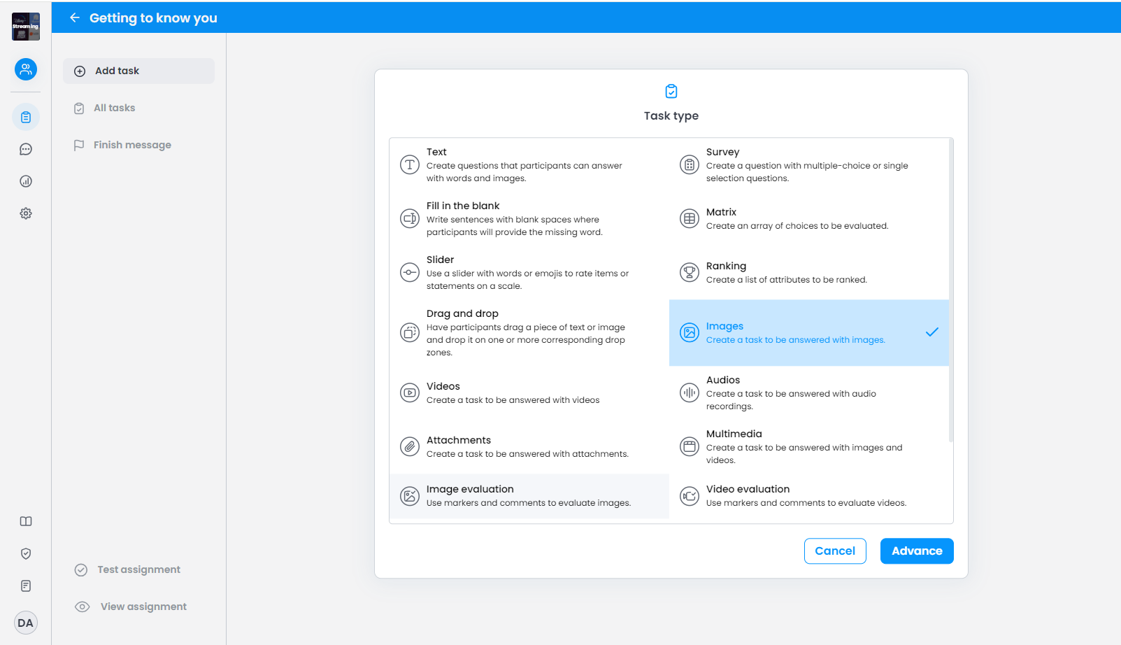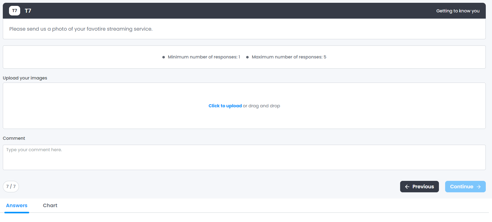 This type of task is used to ask for more precise information about situations, products and places. From the context of the community, it is possible to ask respondents to send photos of the products they use, their environment, etc.