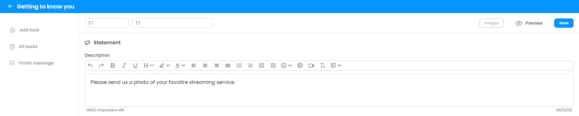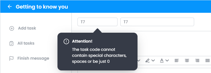 3. You can also change the task (question) code using the rounded field next to the task list. The code of a task is important for identifying the question in the database and also for viewing the answers on the platform. Ow Voices will always place the screen "T" followed by a natural number in ascending order for task codes.