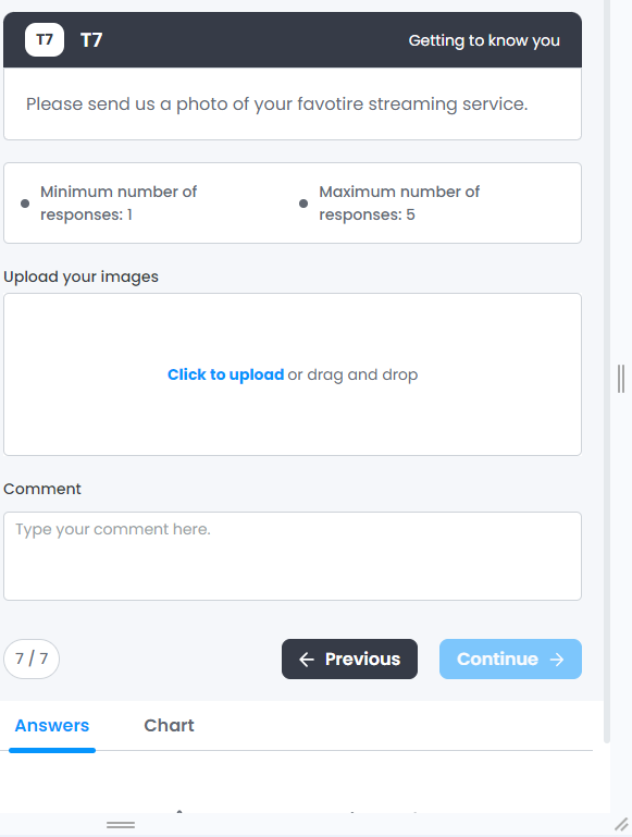 Image is a type of task in which participants have to share images with the community. In general, these photos are directly related to a topic of interest to the community (i.e. 'what they had for lunch', 'where they are going for lunch', etc.). We allow respondents to upload up to 5 images in a single task.