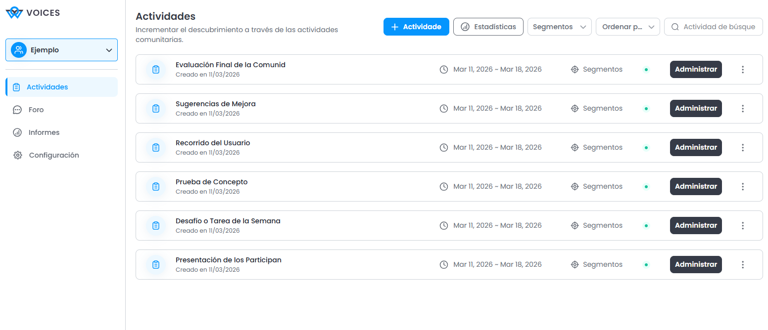 Para obtener instrucciones detalladas sobre cómo crear y gestionar actividades, consulte el documento específico sobre creación de actividades.