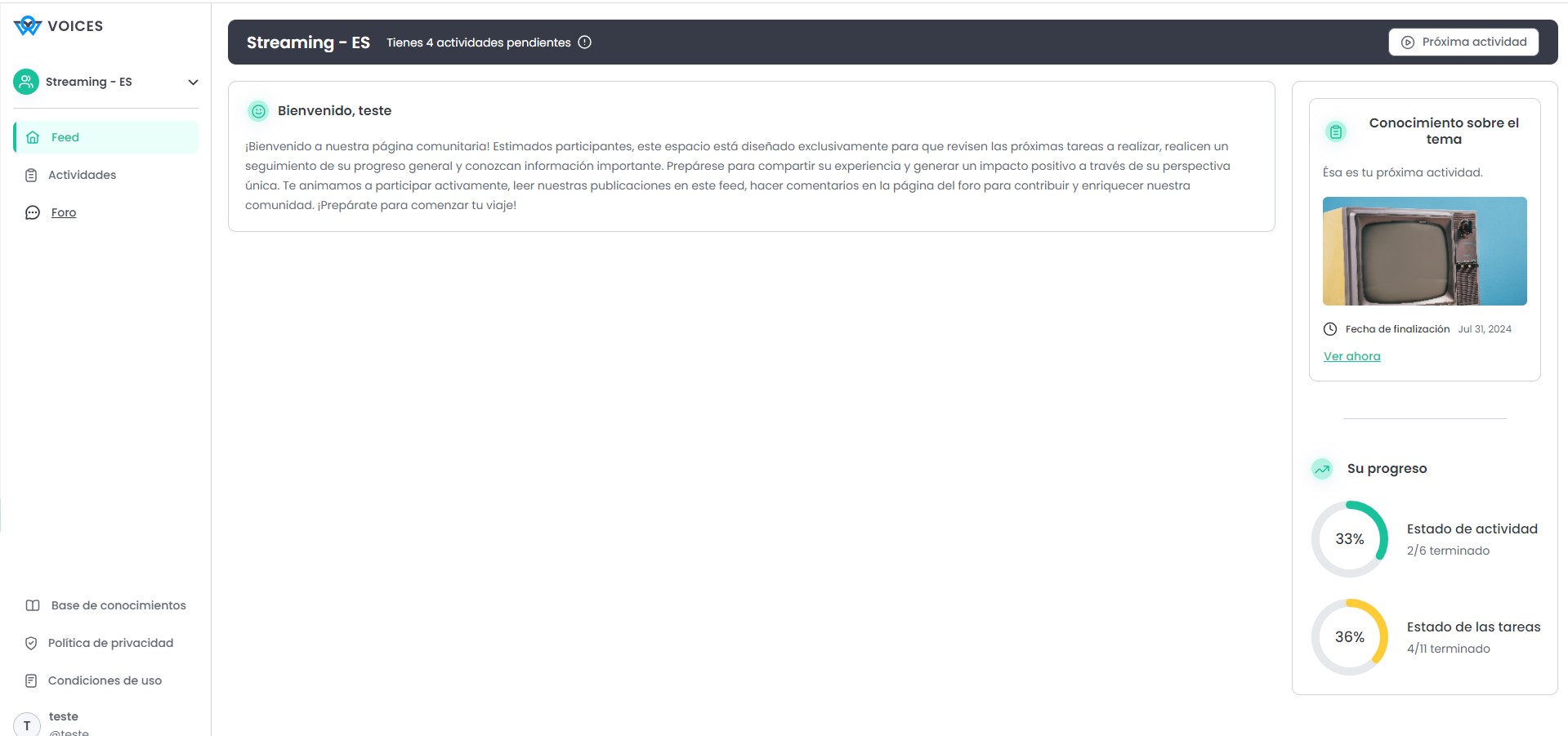 En el "Feed", el Participante podrá visualizar todas las tareas de la Comunidad, además de consultar las actividades pendientes y su avance, y la Guía de la Comunidad.