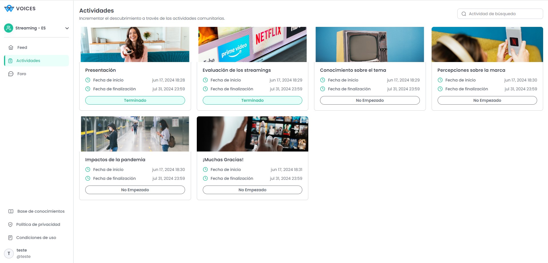 En el menú "Actividades", el Participante podrá ver una lista de todas las actividades disponibles, incluidas las que ya han sido respondidas y las que aún no han sido respondidas.