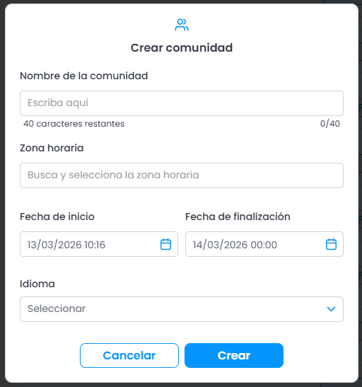 Recuerde que las fechas y horarios respetarán la zona horaria seleccionada. Si usted se encuentra en una zona horaria diferente a la configurada en la plataforma, asegúrese de considerar la diferencia horaria al programar su comunidad.
