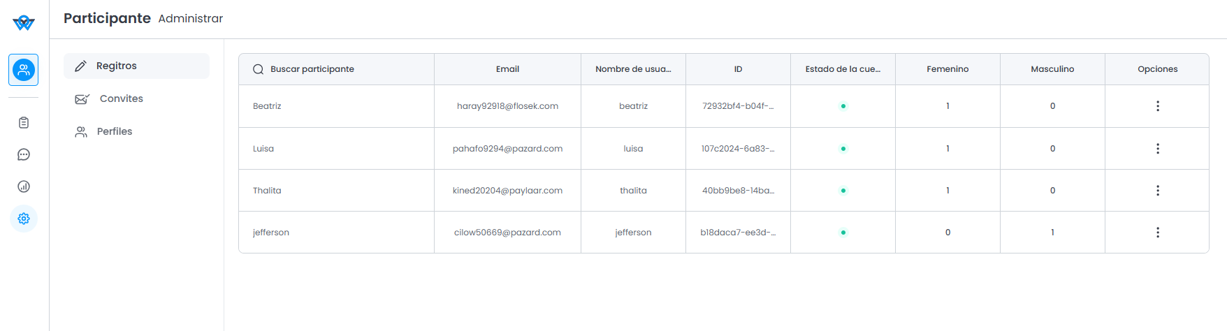 Los administradores pueden, además de consultar la lista de participantes registrados, deshabilitar a los participantes y editar información como IDs, nombre, correo electrónico y segmentos. Los moderadores solo pueden ver y consultar esta información.