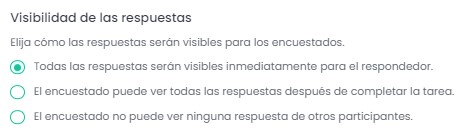 También debes elegir cómo serán visibles las respuestas de la actividad entre los participantes. La primera opción permite que los participantes vean las respuestas de los demás en cualquier momento dentro de la comunidad. Al seleccionar la opción intermedia, los participantes podrán ver las respuestas de los demás después de completar cada respuesta. La tercera opción garantiza que los participantes no tengan acceso a las respuestas de los demás. Aprende más sobre el acceso de los participantes y sus funciones.