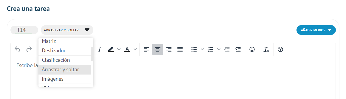 Puede complementar su declaración de tarea con un video, una foto o un archivo. Para hacer esto, simplemente haga clic en el botón "Agregar medios" en la esquina superior derecha del cuadro de texto y cargue