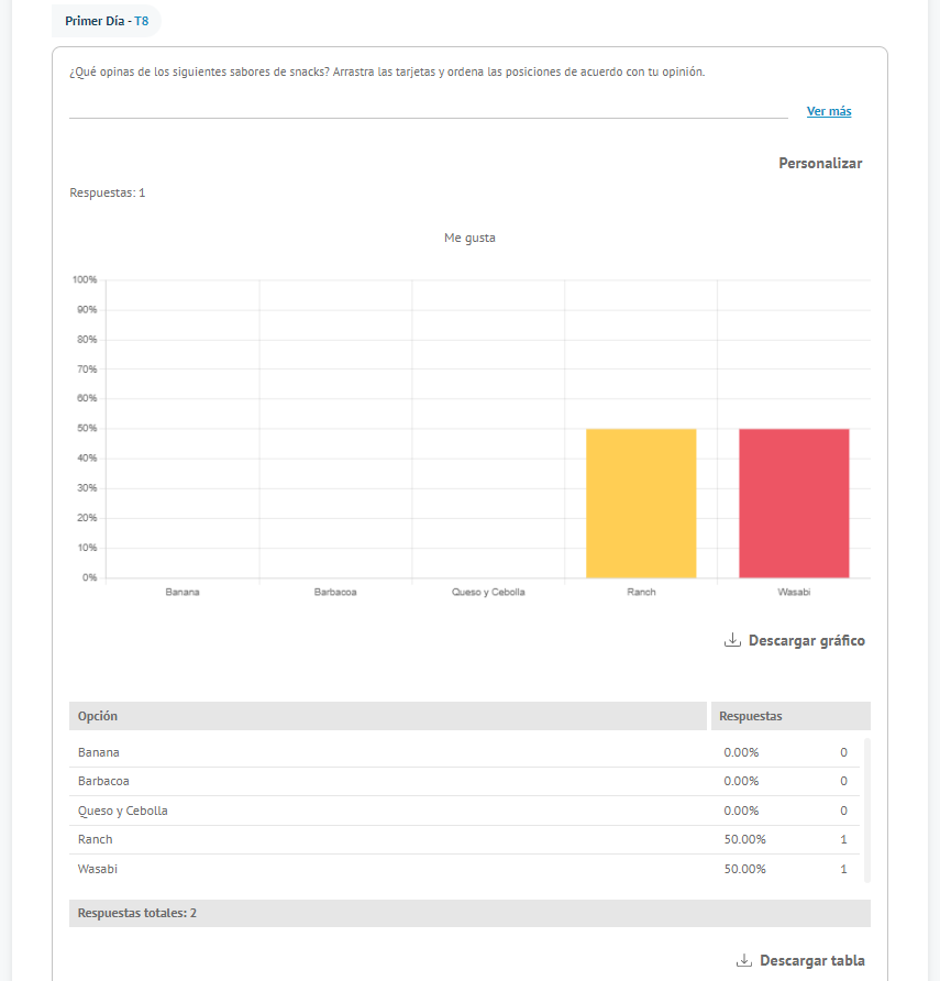 En el menú "Informes", los administradores, moderadores y observadores podrán ver gráficos para todo tipo de tareas. Para las tareas de arrastrar y soltar, se generará un gráfico para cada grupo, con opciones de tarjeta diferenciadas por colores.
