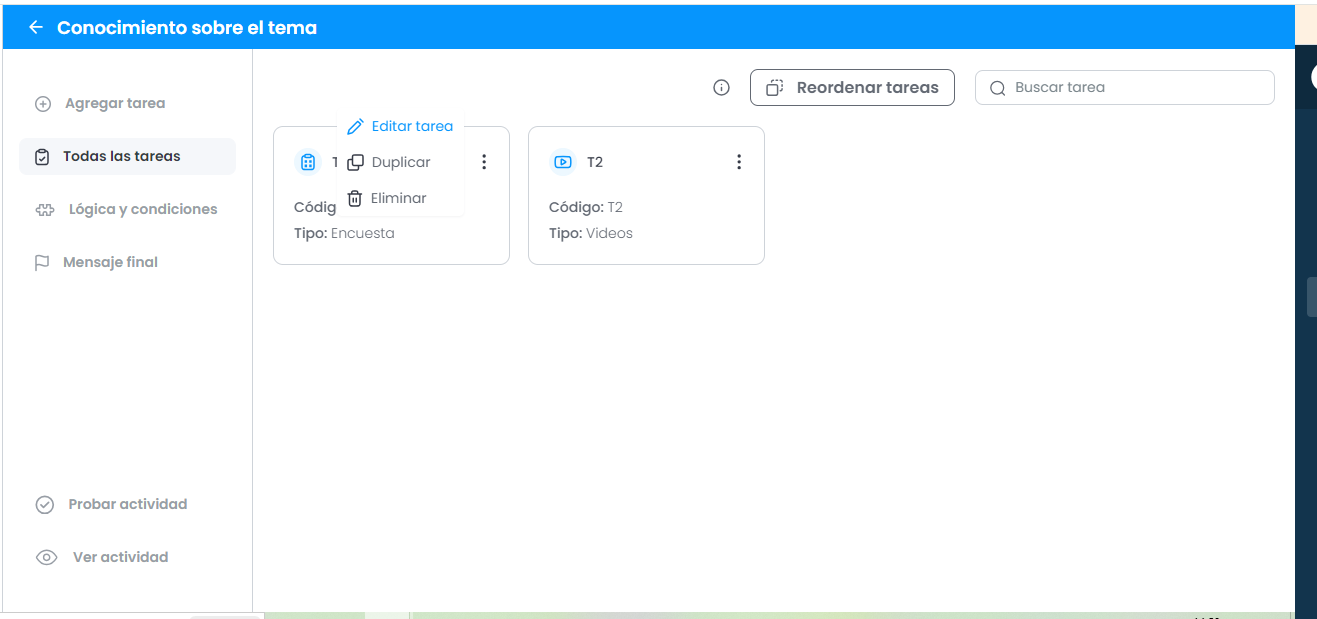 Para crear cualquier tarea, es necesario tener acceso como Administrador o Moderador. Utilizando uno de estos accesos, debes ir al menú de configuración de la actividad y hacer clic en "Editar tareas". Si aún no has creado tu primera actividad, debes crearla antes de continuar. Aprende más sobre cómo crear una actividad.