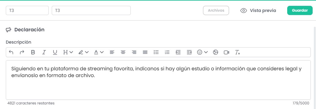 2. Use el cuadro de texto para escribir la declaración de la pregunta, las instrucciones y otra información que considere necesaria. Ajuste el formato del texto utilizando iconos (negrita, cursiva, colores de fondo, colores de texto, alineación, etc.).