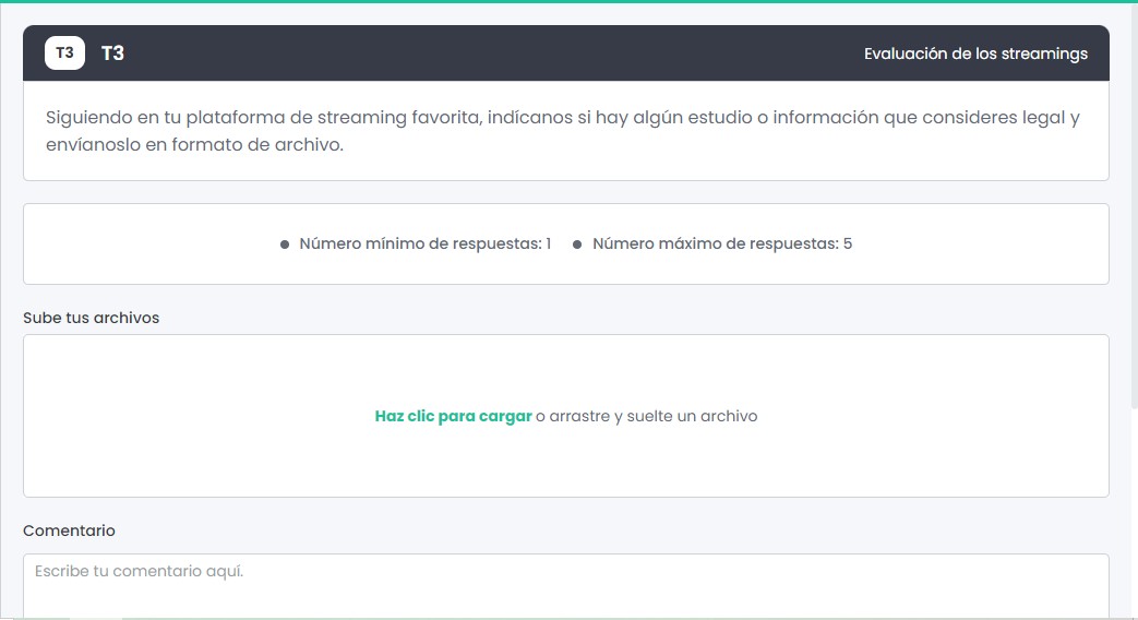 Archivo es un tipo de tarea en la que los participantes deben compartir archivos de cualquier tipo con la comunidad. En general, estos archivos están directamente relacionados con un tema de interés para esa comunidad (es decir, 'complete un formulario de registro', 'envíe un audio contando su experiencia', etc.). Permitimos a los encuestados cargar hasta 5 archivos en una sola tarea.