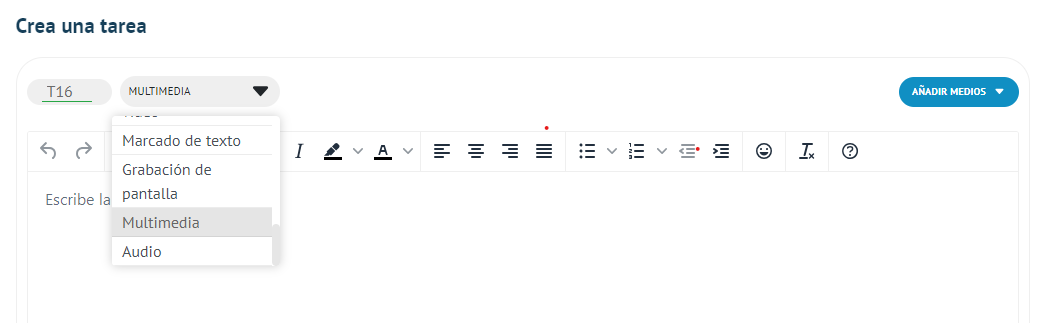 Puedes complementar el enunciado de tu tarea con un video, foto o archivo. Para hacerlo, simplemente haz clic en el botón "Agregar Multimedia" en la esquina superior derecha del cuadro de texto y realiza la carga.