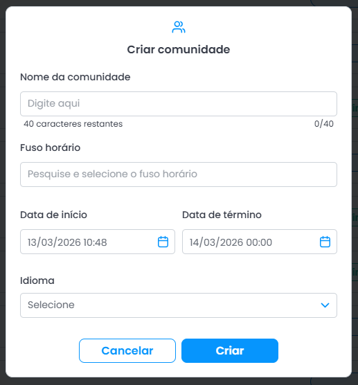 Recomendação: utilize nomes diferentes para cada Comunidade criada. Isso facilita a identificação e a navegação entre diferentes estudos.Fuso horário