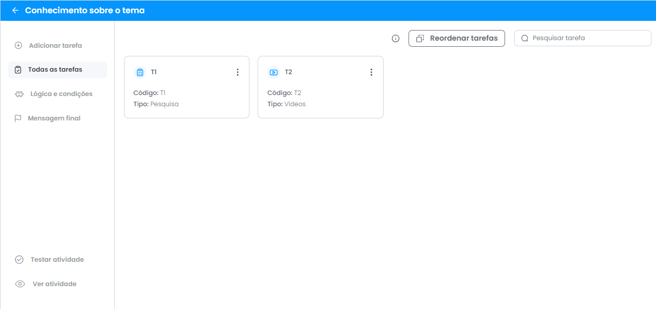 Para criar qualquer tarefa é necessário possuir um acesso de Administrador ou Moderador. Utilizando um desses acessos você deverá ir até o menu de engrenagem da atividade e clicar em "Editar Tarefas". Caso você ainda não tenha criado sua primeira atividade, você deverá criá-la antes de prosseguir. Aprenda mais sobre como criar uma atividade.