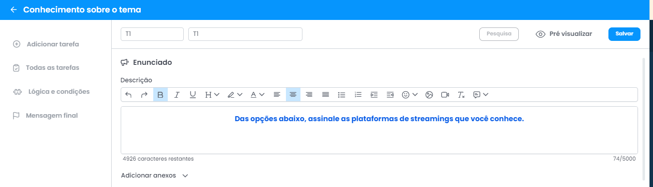 2. Utilize a caixa de texto para escrever o enunciado da questão, instruções e demais informações que julgar necessárias. Ajuste a formatação de texto utilizando os ícones (negrito, itálico, cores de fundo, cores de texto, alinhamento, etc).