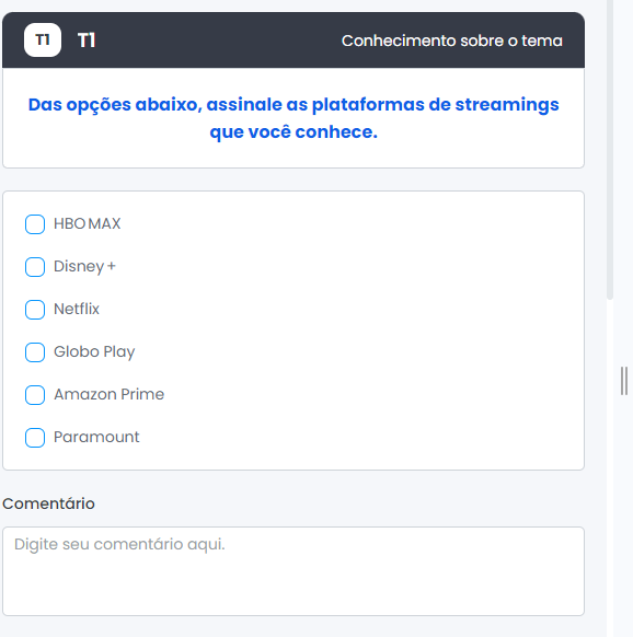 Pesquisa é um tipo de tarefa que apresenta ao participante uma lista de opções predefinidas a partir das quais ele é solicitado a selecionar uma (escolha única) ou mais (escolha múltipla) respostas.