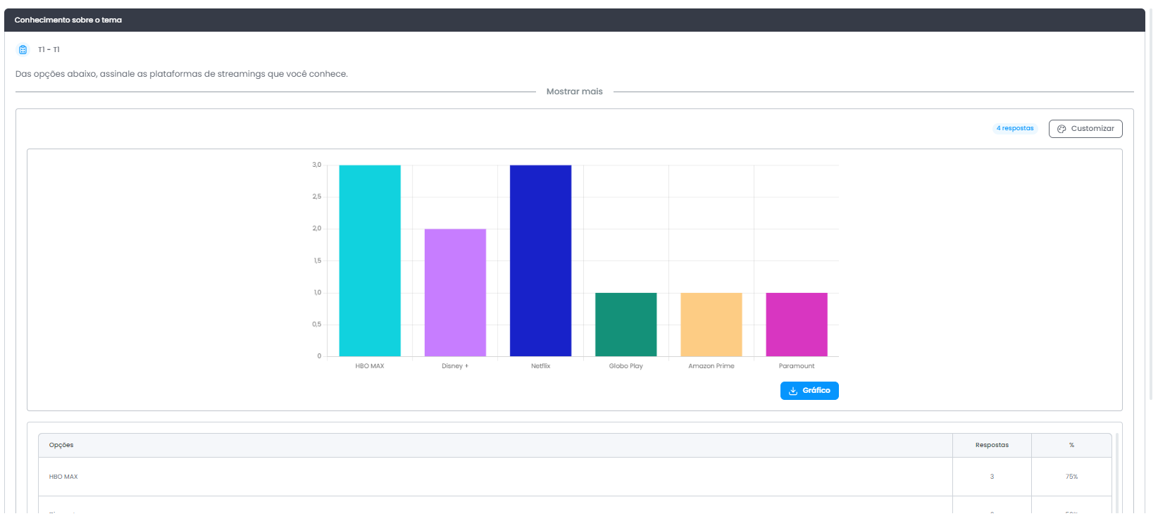 A tabela posicionada abaixo do gráfico irá exibir as respostas em números absolutos e em porcentagens.