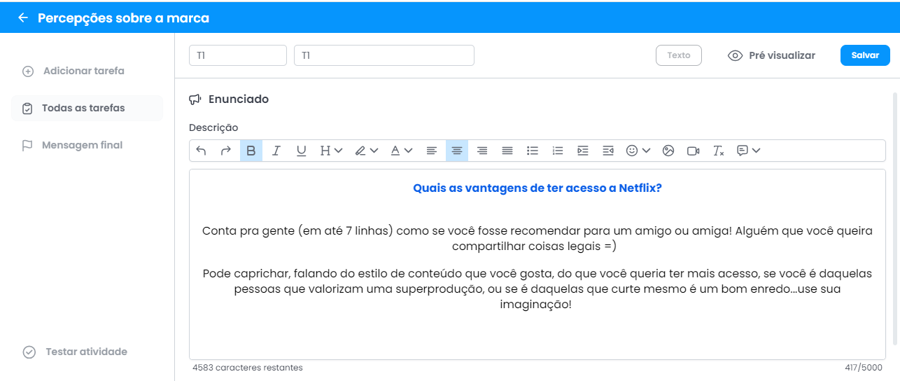2. Utilize a caixa de texto para escrever o enunciado da questão, instruções e demais informações que julgar necessárias. Ajuste a formatação de texto utilizando os ícones (negrito, itálico, cores de fundo, cores de texto, alinhamento, etc).
