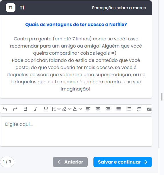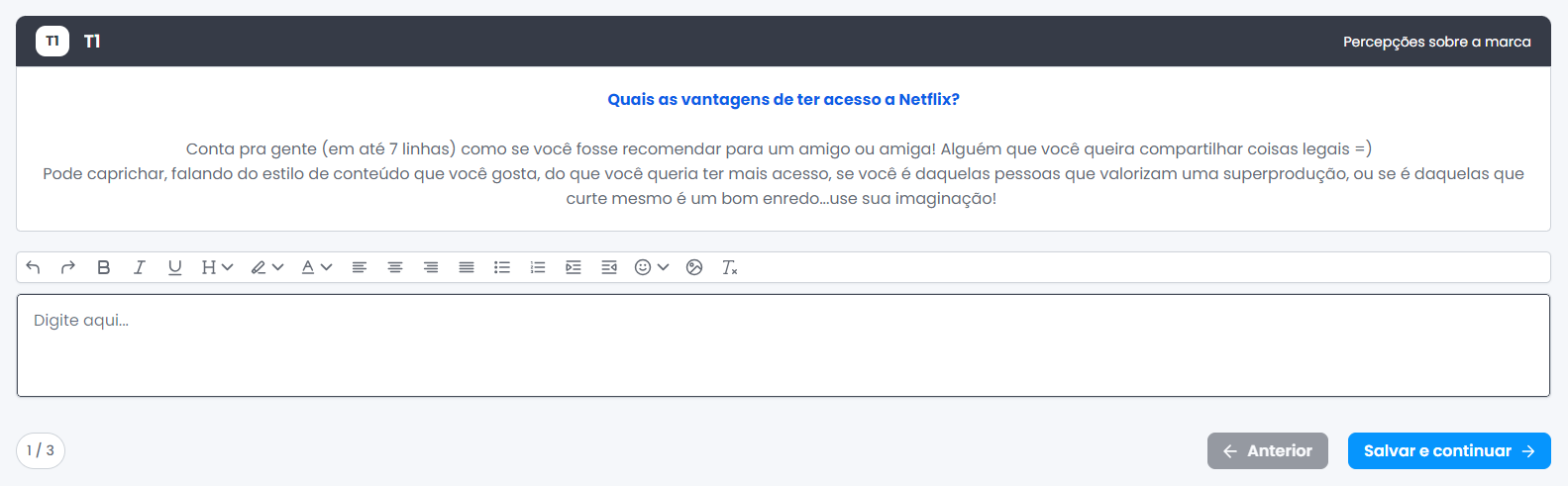 Esse tipo de tarefa é usado para permitir que os participantes entrem em quantos detalhes quiserem e ofereçam dados qualitativos mais profundos.