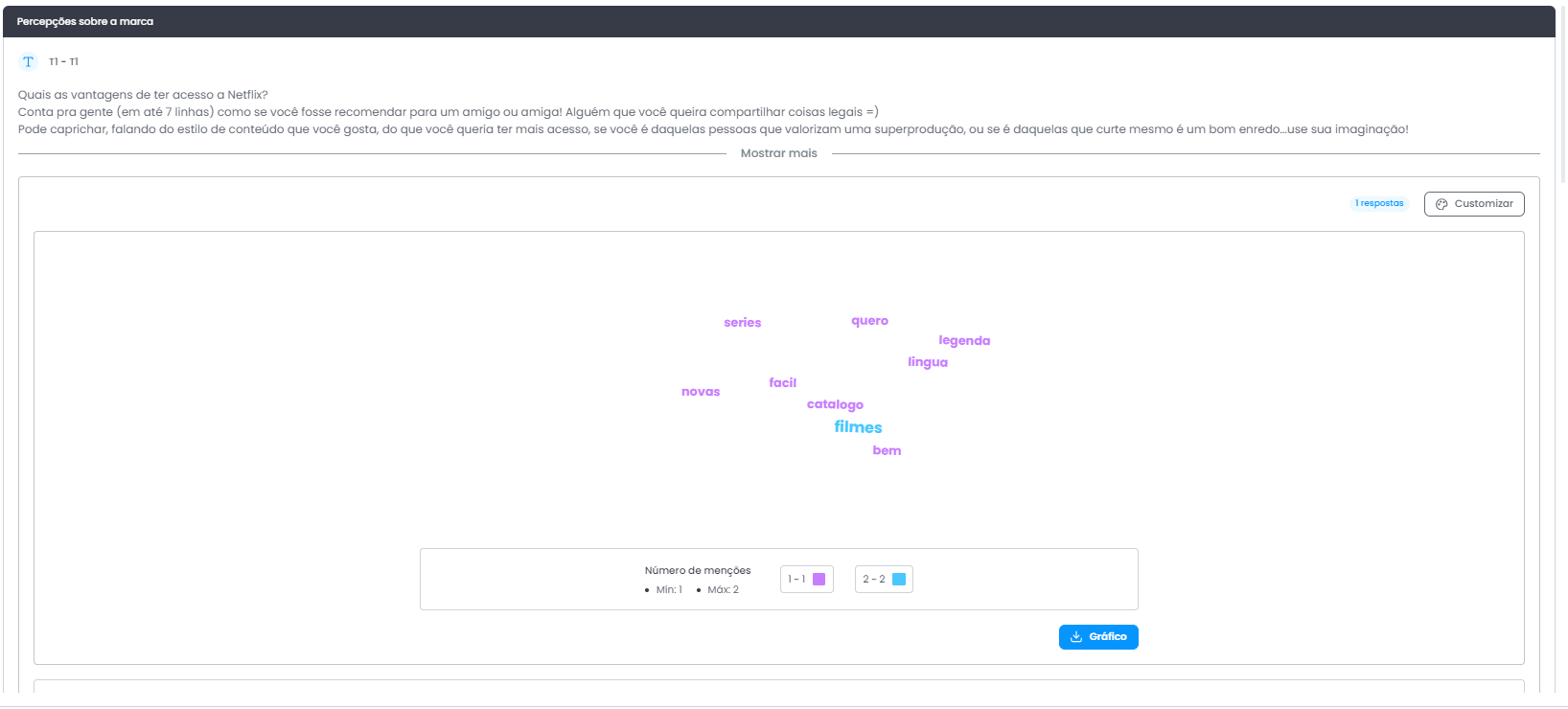 No menu "Relatórios", Administradores, Moderadores e Observadores poderão visualizar gráficos para todos os tipos de tarefas. Para tarefas do tipo Texto será gerada uma nuvem de palavras, com a frequência em que as palavras apareceram diferenciadas por cor.