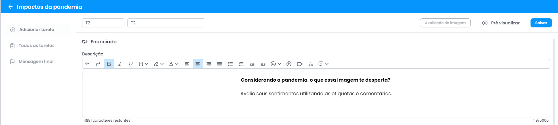 Você pode complementar o enunciado da sua tarefa com um vídeo, foto ou arquivo. Para isso, basta clicar no botão "Adicionar Mídia" no canto superior direito da caixa de texto e fazer o upload.