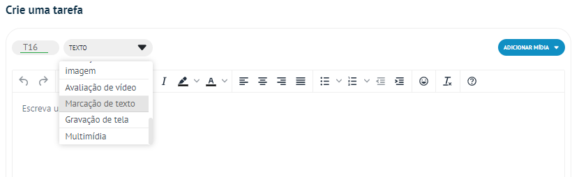 Você pode complementar o enunciado da sua tarefa com um vídeo, foto ou arquivo. Para isso, basta clicar no botão "Mídias" no canto superior direito da caixa de texto e fazer o upload.