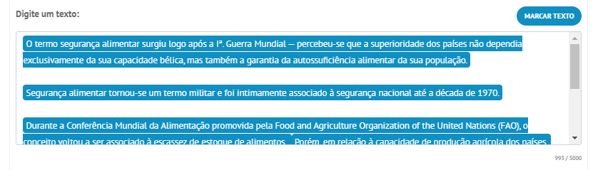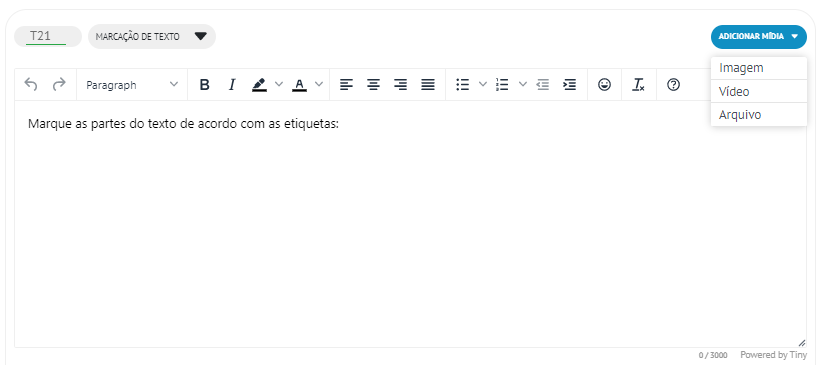 4. Utilize a caixa de texto para escrever ou depositar o texto a ser marcado. Em seguida, informe as partes do texto que poderão ser marcadas pelos participantes clicando no botão "Marcar texto" do lado direito superior.