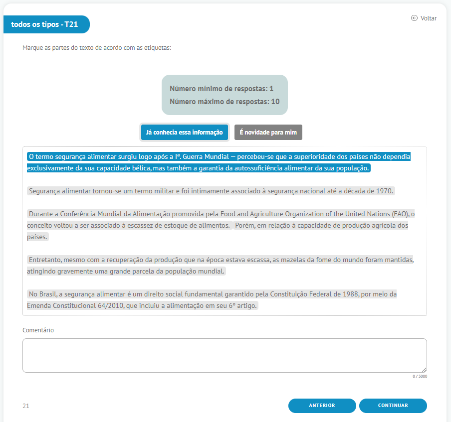 A Marcação de texto é um tipo de tarefa que permite ao participante marcar partes de um texto a partir de etiquetas criadas previamente.