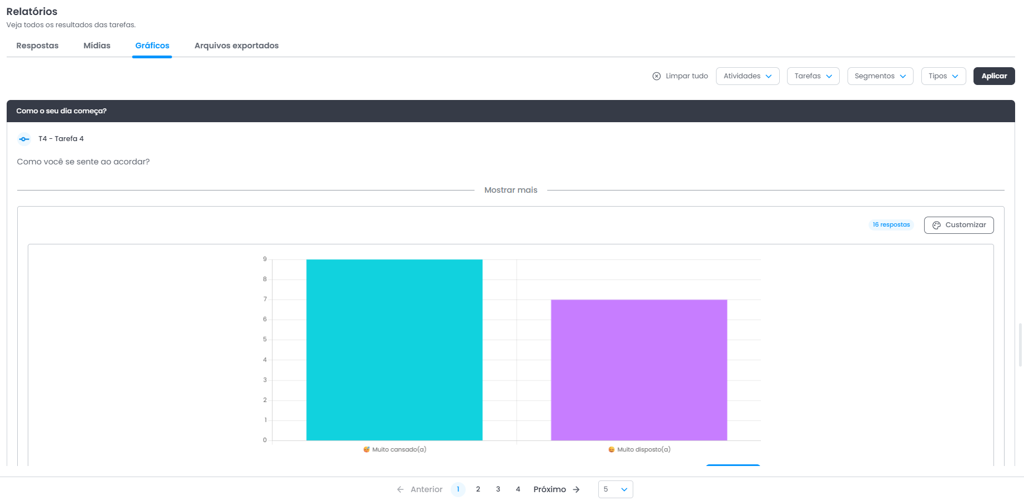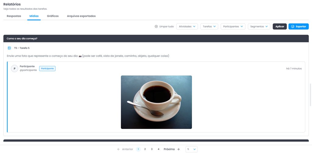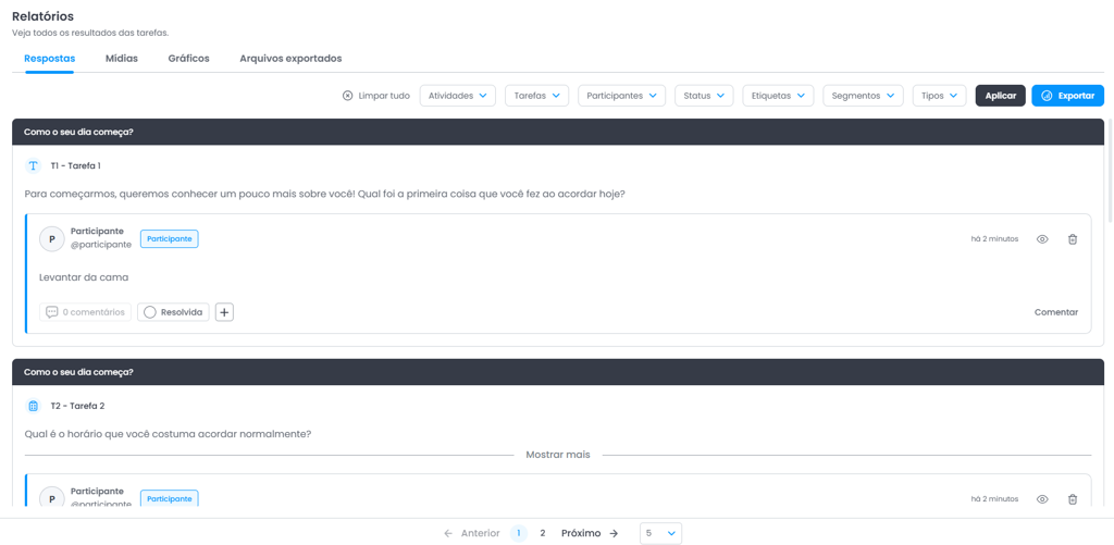 Filtros: A plataforma também permite utilizar filtros para visualizar conjuntos específicos de respostas. As respostas podem ser filtradas por atividades, tarefas, participantes, status, etiquetas e segmentos, facilitando a navegação e a análise dos dados coletados.